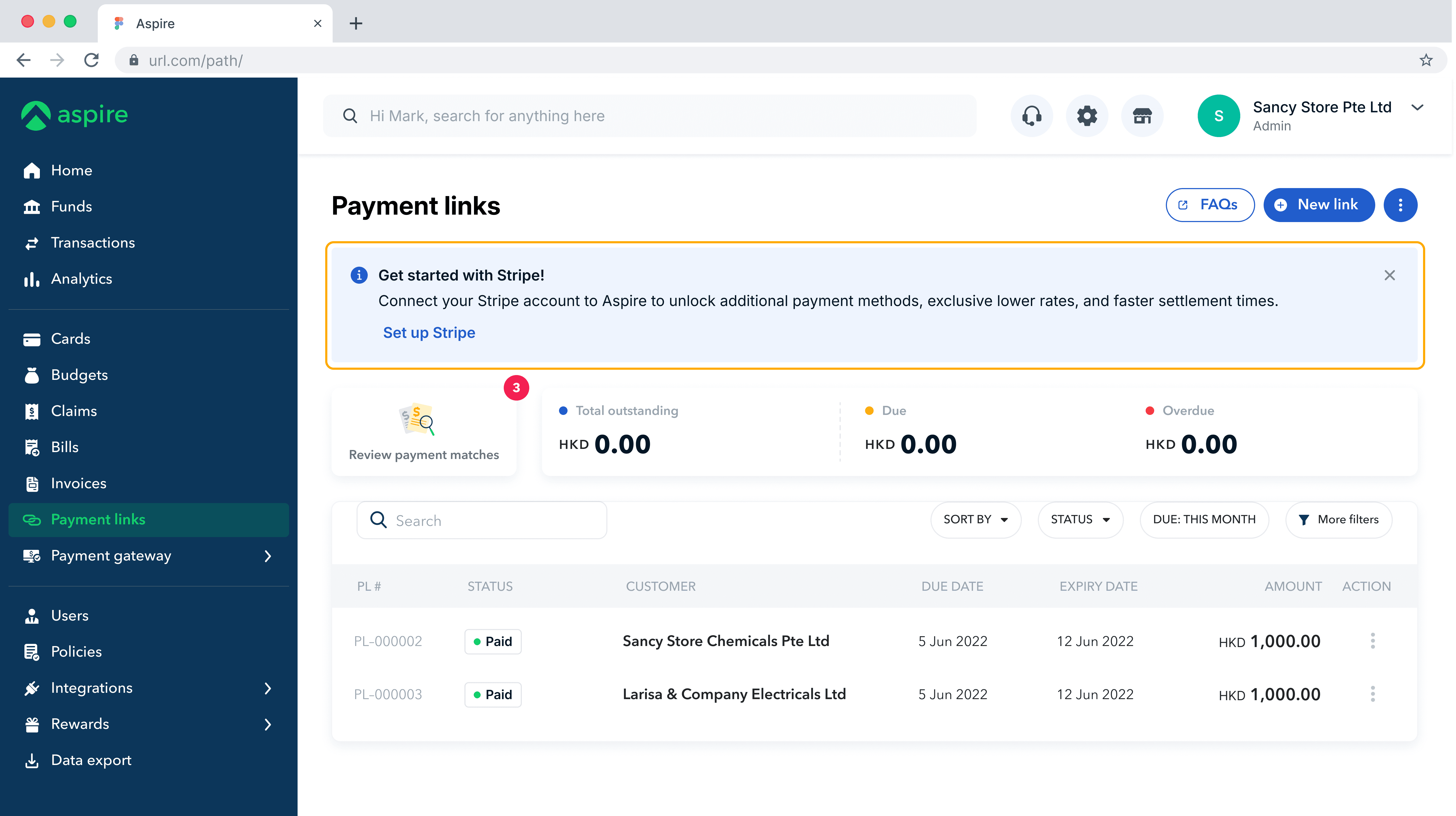 To tackle previous user pain points of not knowing how to setup stripe in Aspire, as well as being confused about general stripe onboarding, resources have now been provided along the user journey, in the form of a hyperlinks and secondary buttons to reduce contact rate-