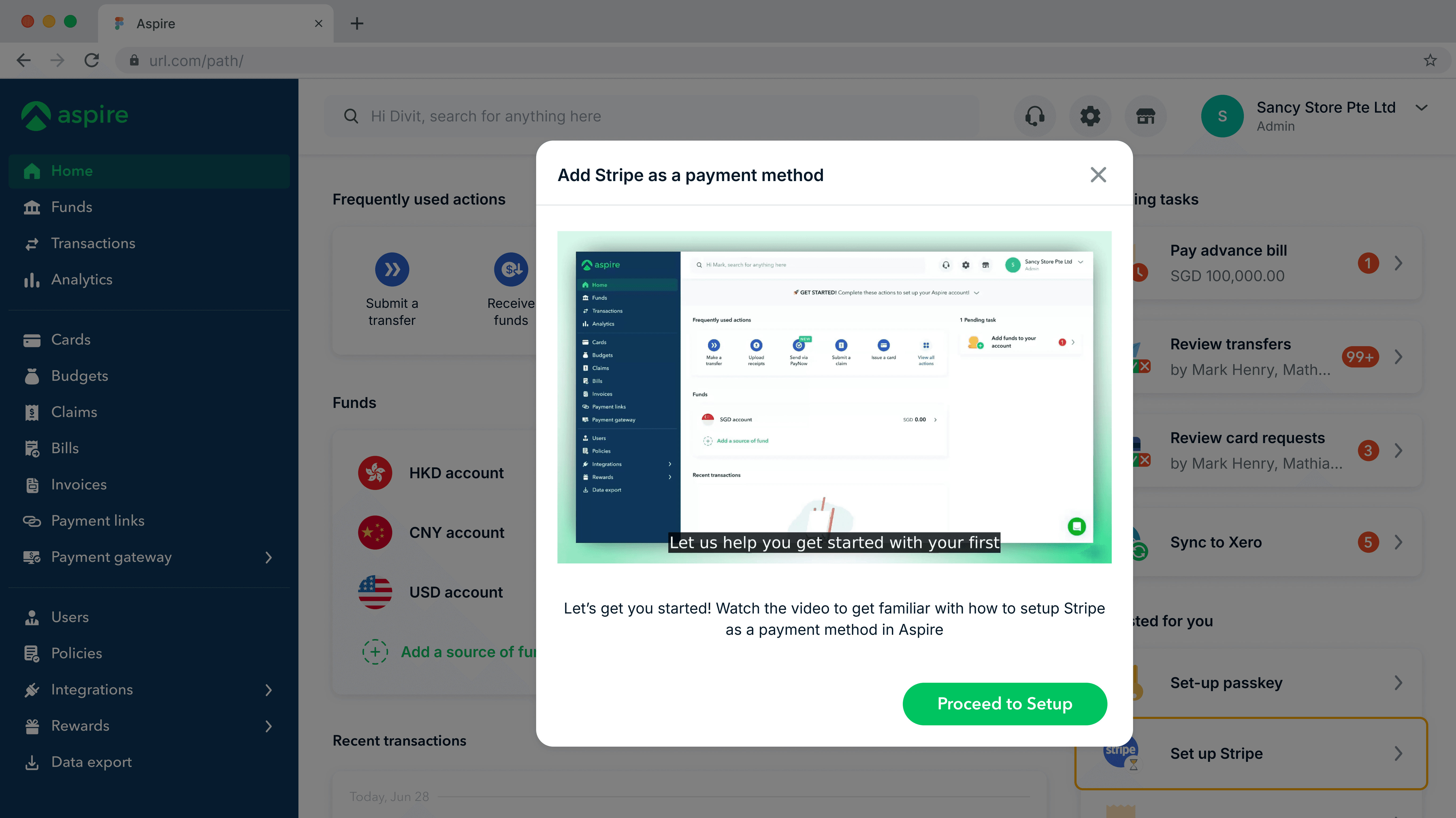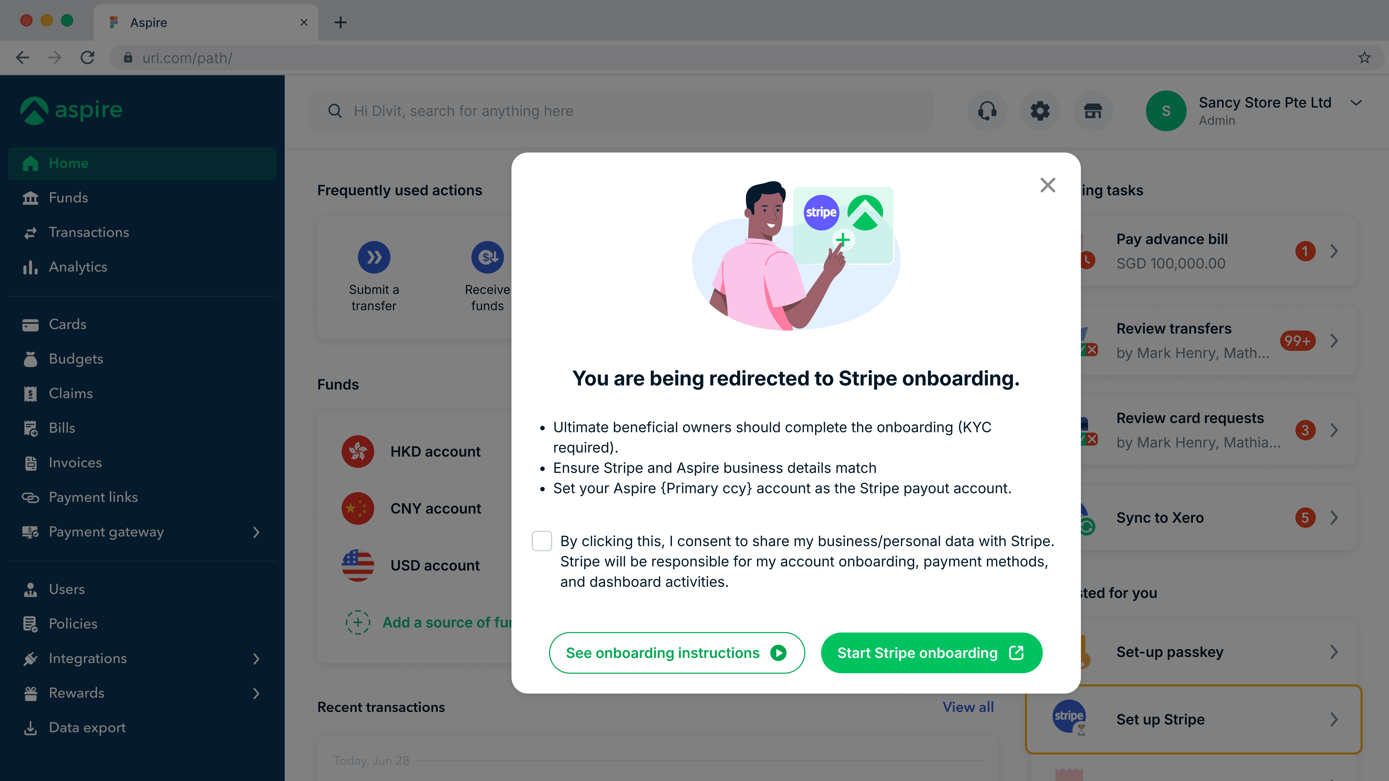 'See onboarding instructions'- Takes the user to a stripe onboarding video resource before launching the actual onboarding flow of Aspire x Stripe through a Stripe portal